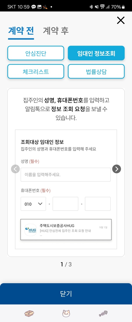 안심전세 앱에서는 계약 전에는 해장주택과 주변시세를 확인/임대인 정보 조회/계약전 체크사항/법률상담에 대한 정보를 얻을 수 있습니다.